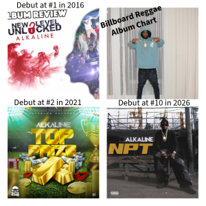 Alkaline 3rd studio album debut at number 10 on the Billboard Reggae Album Chart with NPT. It is the first album released in 2026 to debut on the chart, the first hardcore dancehall release to appear this year and place the “Gyal Good” deejay as the first Jamaican artist to make a chart debut in 2026.